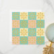 A seamless pattern with geometric floral motifs in yellow, pink, and teal on pastel squares, creating a vintage, harmonious, and cheerful design.
