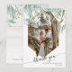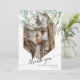 "Tarjeta de agradecimiento de foto con follaje dorado rosa geométrico moderno simple." El follaje de hoja de eucalipto cuelga sobre la parte superior de un marco suave con brillo dorado rosa. Una hermosa fuente de caligrafía, "gracias" y sus nombres con la fecha de su boda (u otra información) se personalizan fácilmente. En el reverso hay el mismo follaje de hoja y un fondo de madera de cabaña blanco suave que le permite escribir a mano su mensaje personal. Arte pintado y diseñado gráficamente por la artista y diseñadora licenciada internacionalmente, Audrey Jeanne Roberts, derechos de autor.
