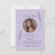 Sencilla Elegante Lavanda Blooms Funeral Memorial Gracias Tarjeta. Esta tarjeta conmemorativa contiene una foto circular sobre el fondo de Lavender y un texto de agradecimiento en la parte inferior. La parte trasera de la tarjeta muestra unas impresionantes flores de lavanda en cascada. Haga clic en "Personalizar esta plantilla" para intercambiar sus detalles.