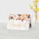 Esta tarjeta de rosa floral Shabby Chic tiene un borde de acuarela en tono durazno y naranja en la parte superior. Los colores utilizados incluyen verde oliva, óxido, durazno, ciruela y naranja. En el centro hay texto estilizado en dorado que dice "Agradecida contigo". El interior tiene un borde de rosa floral en la parte superior e inferior con espacio para que escribas tu propio mensaje. Todo se muestra sobre un fondo blanco crujiente. Esta tarjeta coordina con la colección Give Thanks Floral Pumpkin. También están disponibles forros de sobre a juego. *La letra dorada no es de lámina metálica*.