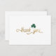 Esta elegante y elegante tarjeta de agradecimiento incluye un trébol verde de cuatro hojas (shamrock) encima de las palabras "Gracias" en una fuente de guiones de oro (Relieve metalizado simulado). El fondo es blanco, pero puede cambiarse a cualquier color que desee. La parte trasera de la tarjeta incluye un área para que usted añada su propio mensaje personal.