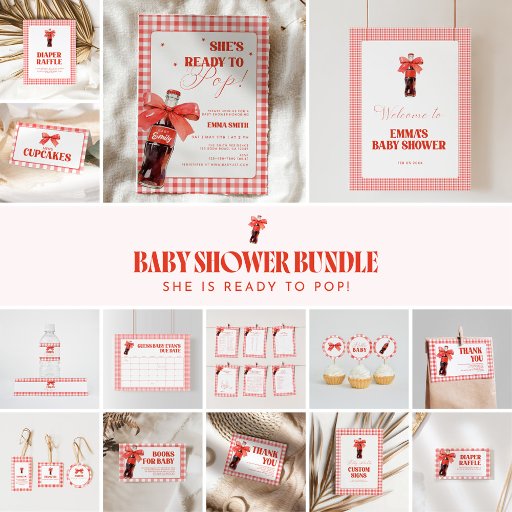 Celebrate your baby shower with this “She Is Ready to Pop” invitation designed in vibrant red tones with a playful soda pop illustration, gingham background, and coquette bow details. Perfect for a bold yet preppy baby shower theme, this invitation coordinates beautifully with the full soda pop collection.