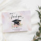 A clean and modern graduation party thank you card. The front features an elegant abstract watercolor background. Soft pale purple and blush pink tones add a gentle, feminine touch, creating a polished and stylish card for show you appreciation to celebrating this special milestone with you. A beautiful watercolor illustration of a student cap with gold tassel with pretty pink flowers and green leaves.