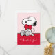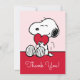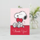 Send your thanks with the purest expression of affection! This beautiful Snoopy Thank You Card features the beloved beagle sweetly holding a bright red heart against a soft pink background. It's the perfect card for conveying deep appreciation, whether it's for a thoughtful gift, a kind gesture, or to celebrate love on any occasion. This card inside message to match your heartfelt sentiments. The classic black-and-white Snoopy illustration paired with the gentle pink backdrop creates an instantly warm and affectionate greeting that recipients will cherish.
