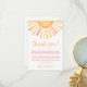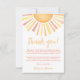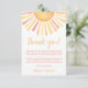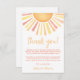 Esta tarjeta de agradecimiento con tema de sol, brillante y alegre, es una forma perfecta de expresar gratitud después de su celebración. En la parte superior, un gran sol con rayos vibrantes en tonos de amarillo, naranja y un toque de rojo añade un toque cálido y alegre.