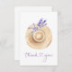 Este diseño presenta una ilustración de acuarela de flores de lavanda que descansan sobre un sombrero de paja. El texto "gracias" está escrito en una fuente de escritura con corazón unido.