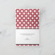 Tarjetas de agradecimiento con un patrón de lunares surtidos con círculos blancos de tamaños alternados sobre un rojo estilo café. "Gracias" está impreso en diagonal en blanco en la parte delantera sobre una franja negra diagonal en la esquina inferior derecha. El interior está impreso personalizado con su propio texto, o puede dejarse en blanco fácilmente escribiendo a mano sus propios sentimientos de agradecimiento. Alrededor de esta área de texto de plantilla está el mismo patrón de lunares surtidos, un elemento único en oposición al interior blanco típico. Este estilo y esquema de colores hacen que estas tarjetas sean una opción apropiada para despedidas de soltera, baby showers y cumpleaños.