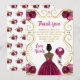 This sweet sixteen birthday thank you card features an elegant gold frame, a beautiful princess with dark skin and a burgundy red dress, flowers and a balloon.