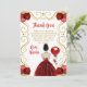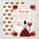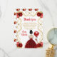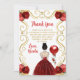 This sweet sixteen thank you card features an elegant gold frame, a beautiful princess with brown hair and a red dress, flowers and a balloon. This is perfect for a sweet sixteen birthday party.
