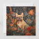 Encantadora ilustración de un dulce Frenchie o Bulldog Francés de pelaje cervato en un antiguo jardín inglés al estilo de William Morris.