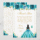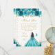 This elegant and glamorous birthday thank you card features a beautiful princess with dark hair and dark skin in a teal blue ball gown. The text combines handwritten script and modern sans serif fonts for a classy and sophisticated look. The floral arrangements, butterflies and gold confetti create the perfect blend of rustic and chic.