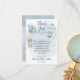 Diseño de Baby Shower lindo con un oso de peluche con una corbata azul que cuelga de un montón de globos en un lado con un globo de aire que lleva un ramo de flores en el lado derecho. Banderas de Bunting cuelgan entre los dos globos que apoyan las palabras "¡Gracias!" Nubes y estrellas sobre un fondo de color azul acuático rodean el diseño. En la parte posterior se ve el fondo del cielo acuarela con puntos de polka blancos y beige. Diseño compuesto por Holiday Hearts Designs.