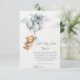 This adorable thank you card features a sweet watercolor teddy bear with soft blue balloons and fluffy clouds, creating a charming and gentle design perfect for a baby boy celebration. The soft blue tones and cute teddy bear artwork give a warm storybook feel that beautifully matches a teddy bear baby shower theme.