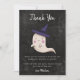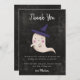 Tarjeta de agradecimiento de cumpleaños con tema de Halloween con una ilustración de un fantasma con sombrero de bruja en un fondo de pizarra negra. El mensaje agradece al invitado por asistir a la fiesta y por el regalo. Tema perfecto de otoño para el cumpleaños de una niña.