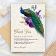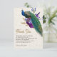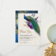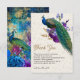 Tarjeta de agradecimiento de boda elegante con un majestuoso pavo real con hermosas flores. Voltea la tarjeta para revelar un arte de decoupage rústico en la parte posterior de la tarjeta.