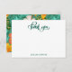 Tarjeta de agradecimiento floral tropical moderna y trendy con fondo verde y flores y hojas lindas. Esta tarjeta es ideal para un baby shower de verano o una despedida de soltera en la playa.