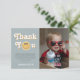 Esta tarjeta de agradecimiento para el primer cumpleaños de un chico con vibraciones retro de los 70 captura un tema de sonrisa azul adorable y un patrón de cuadros azul pastel en la parte posterior. Totalmente personalizable, incluye espacio para tu mensaje, una foto y nombre. Perfecta para un cumpleaños boho de "Un Chico Genial".