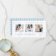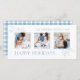 Diseño de vacaciones botánicas minimalistas limpias con saludo de guiones de Happy Holidays con hojas azul polvorientas trazadas en línea, plantilla de tres fotos y campo de texto editable con patrón tartán azul complementario en la parte posterior.