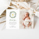 Esta carta de agradecimiento, sencilla y minimalista, incluye una elegante cortina de acuarela llena de vegetación rústica y follaje, con un ilustracion de cáliz y sutiles acuarelas verdes en el centro, sobre un fondo blanco. La foto de su bebé también aparece.