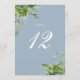 Estos elegantes números botánicos de boda floral de vegetación se pueden personalizar en la tipografía de moda sobre un polvoriento fondo azul. Las tarjetas se imprimen en la parte delantera y trasera (de doble cara). Diseñado por Thisisnotme©