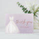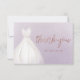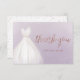 Tarjetas elegantes de agradecimiento con vestido de crema en acuarela con escritura de agradecimiento con brillo de rosa dorada falsa en fondo suave púrpura.