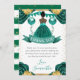 Elegante acuarela princesa de piel oscura en Verde azulado diseño de vestimenta con flores Verde azuladas y doradas, globos y confeti purpurina dorado.