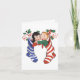 Ilustración vintage de Navidad con dos niños colgados en medias de Navidad decoradas con hojas y bayas de acebo. El niño está en la media a rayas rojas y blancas y la niña está en la media a rayas azules y blancas.