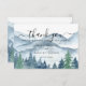 Elegant rustic watercolor mountains and forest scene wedding thank you card, featuring lush blue and green trees and mountains with a script text: let the adventure begin. For those who love a romantic dreamy woodland vibe for their ceremony and celebration.