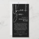 Gracias tarjeta por un servicio conmemorativo que incluye una foto de tu ser querido en la parte de atrás. En la portada, debajo de Gracias escrito en un guión de escritura a mano, agregue la frase de agradecimiento en blanco contra un fondo negro.