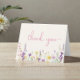 An elegant light cream baby girl shower thank you card featuring "thank you" showcased n a stylish pink calligraphy script, and whimsical boho-inspired watercolors of dainty purple, pink and yellow wildflowers. On the inside, personalize your thank you message and add your name in a signature-like script, or leave blank for a hand-written note.