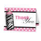 Elegantes y modernas tarjetas de agradecimiento de Baby Shower diseñadas con un patrón de estampado de cebra botella de bebé sobre puntos de polka blanco sobre rosado. El interior es personalizado impreso con su propio mensaje personalizado de agradecimiento y firmado con su nombre, o puede borrar fácilmente el texto de la plantilla para dejar el área del mensaje en blanco dentro para escribir a mano sus sentimientos. Estas tarjetas de agradecimiento de biberón de bebé con estampado de cebra son perfectas para las celebraciones de su bebé con estampado de cebra o con temática de cebra. Sin orden mínima. Existen descuentos masivos.