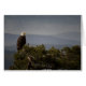 Águila calva madura sentada en un árbol de flores con la isla de Vancouver al fondo.
