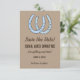 Tarjetas de invitación de boda personalizadas de estilo vaquero occidental con herraduras azules para salvar la fecha.