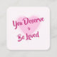 ¡Levanten el ánimo de alguien con tarjetas de bondad! Estas son tarjetas cuadradas del tamaño de las tarjetas de visita con palabras positivas y inspiradoras para repartirlas a los amigos, esconderse en los almuerzos de los familiares o irse a un extraño para encontrar que iluminar su día. Este diseño incluye un corazón rosado y el texto "Te mereces ser amado".
