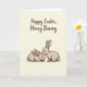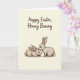 Esta tarjeta presenta dos conejos estilizados acurrucados cerca, delineados con líneas finas y rellenos con un tono taupe suave que sugiere un pelaje suave 🐰. Un conejo se para erguido y se inclina para acariciar la cabeza del otro, mientras que el segundo se reclina con calma con ojos anchos y expresivos que dan al par una apariencia tierna y afectuosa. La ligera sombra agrega un sutil sentido de profundidad a lo largo de sus orejas, mejillas y cuerpos, manteniendo el dibujo simple pero cálido. El fondo es un beige cremoso que se siente tranquilo y aireado, dejando que los conejos sigan siendo el punto focal claro. Cerca de la parte superior, un breve saludo de Pascua aparece en letra cursiva fluida, colocado en marrón oscuro para un fuerte contraste contra el fondo pálido 🌷. El texto está centrado sobre la ilustración, dejando un espacio abierto cómodo entre las palabras y los conejos debajo. La nariz del conejo de pie toca la frente del