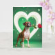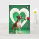 Diseñado con un ambiente de retrato de estudio, un Boxer digno permanece centrado contra un fondo verde profundo, sosteniendo suavemente una sola rosa roja en su boca 💚. Su pelaje atigrado y pecho blanco brillante resaltan nítidamente, y la postura erguida del perro sugiere que está allí para alguien especial. Un contorno de corazón blanco en capas se encuentra detrás del Boxer, enmarcando su cabeza y hombros y sugiriendo romance sin necesidad de un solo accesorio adicional. Los ojos del perro se dirigen hacia arriba y hacia la derecha, como si estuviera viendo a una persona favorita entrar, mientras que el ligero destello de los dientes inferiores alrededor del tallo añade un toque dulce y sincero. Los pétalos rojos de la rosa y el tallo verde se convierten en el contraste de color principal, llamando la atención directamente hacia el "regalo" en el centro del momento ☘️. La luz cae suavemente sobre el pelaje y la rosa, añadiendo un brillo suave al pelo y un aspecto aterciopelado a los pétalos. No hay texto en el frente, dejando que el contorno del corazón y la rosa hablen