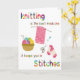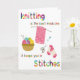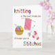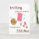 Un hermoso diseño con un mensaje de apoyo. La cita " Tejer es la mejor medicina, te mantiene en puntadas" está en un texto brillante y colorido. La tarjeta muestra una cesta llena de hilo colorido, tijeras, un alfiler y dos bolas de hilo rosa sobre un fondo blanco.
