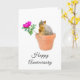 Una ardilla en una olla de flores sostiene un rosa magenta en esta dulce tarjeta de aniversario.