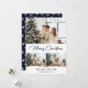Foto azul personalizado Ferry Christmas card, con un collage de fotos con un tipo de letra moderno en el frente y un fondo azul oscuro con nieve en caída y estrellas en la parte posterior. Personaliza fácilmente esta tarjeta azul de vacaciones con fotos, el nombre de la familia y el año.