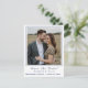 El diseño presenta la foto que proporcionas como diseño principal que se muestra sobre un fondo blanco y enmarcado por un borde elegante de color azul marino. Justo debajo de la foto, tu texto que contiene el título, los nombres y la ciudad y el estado de la boda se muestran en una fuente azul marino que coincide.