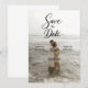 Anuncie su próxima boda con una elegancia atemporal utilizando nuestra "Tarjeta de guardar la fecha con foto de playa elegante". Este diseño captura perfectamente el romance y la serenidad de su historia de amor con un hermoso fondo de foto personalizable.