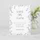Anuncie su día especial con estilo con esta sofisticada tarjeta de "Guardar la fecha" que presenta un marco floral azul bellamente ilustrado. El diseño combina una paleta de colores azul atemporal con tipografía moderna, creando un ambiente lujoso y romántico. Agregue su foto al reverso.