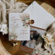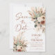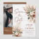 Establece el tono para tu gran día con esta Tarjeta de Guardar la Fecha Rust Boho Terracotta. Este diseño presenta un impresionante arreglo de flores secas, eucalipto y hierba de pampas plumosa en una paleta de colores cálidos y terrosos de terracota, crema y salvia polvorienta.
