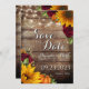 Tarjeta de anuncio de boda rústica de calabaza de otoño. Anuncie su compromiso con estilo con nuestra tarjeta de anuncio de boda rústica. Cuenta con un fondo de madera marrón con vegetación dispersa por todas partes, así como girasoles amarillos, calabazas y rosas burdeos.