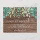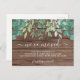 Está decorada con follaje de acuarela en tonos verdes y un fondo de madera de granero.