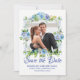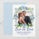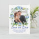 Muestre la foto de la pareja favorita mientras anuncia la fecha de su boda. Un marco romántico rodea su foto. Hermosas flores azules y blancas crean un ambiente romántico. 'Save the Date' está escrito debajo en una fuente de letra formal y elegante. Sus nombres están en letras mayúsculas. La fecha y ubicación siguen. Es muy fácil insertar su propia foto y texto.