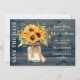 Establece el tono para tu boda campestre con esta tarjeta de anuncio de fecha de boda con girasol rústico que presenta un ramo en un tarro de mason, fondo de textura de madera y caligrafía romántica. Ideal para bodas de otoño, lugares de granero o celebraciones con tema de girasoles. Personaliza fácilmente con tus nombres, fecha y mensaje personalizado para crear una primera impresión emotiva.