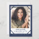 La tarjeta de anuncio de graduación azul marino con 2 fotos elegante es perfecta para el graduado de secundaria o universidad que busca una tarjeta simple pero trendy. Incluye espacio para 2 fotos, una en la parte frontal y otra en la parte trasera. Personalice el texto para que diga lo que desee.