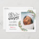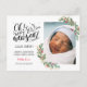 Tarjeta de anuncio de nacimiento de bebé con una foto de un bebé recién nacido rodeada de flores doradas y acuarela con elegante letra manuscrita “¡Oh! Bebé es Año Nuevo”