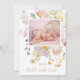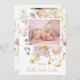 Anuncie el nacimiento de su pequeña niña con esta preciosa tarjeta de invitación. Los arreglos de florales en tonos de rubor, lila y crema hacen de esto algo especial. Muestra fotos de tu recién nacido a ambos lados de la tarjeta. Fácil de cambiar el estilo y el color del tipo de letra. Personaliza con tus datos de nacimiento y tienes algo muy especial.